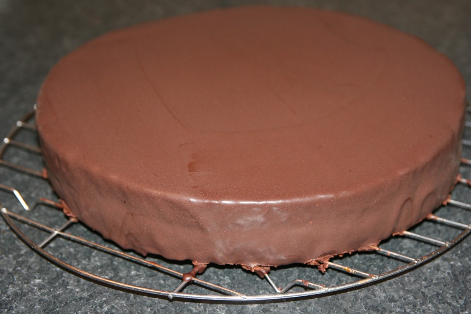 Ungem cu glazura marginile tortului, apoi cu restul de ciocolata imbracam tortul, turnand glazura in mijlocul tortului si niveland cu un cutit cu lama lata sau miscand tortul pentru a curge glazura peste margini. Dam tortul la rece pana se intareste glazura.